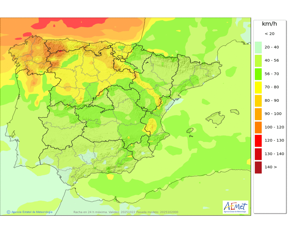 De componente oeste girando a componente norte, flojo con intervalos de moderado. Más intenso en cotas altas, donde soplará generalmente fuerte.