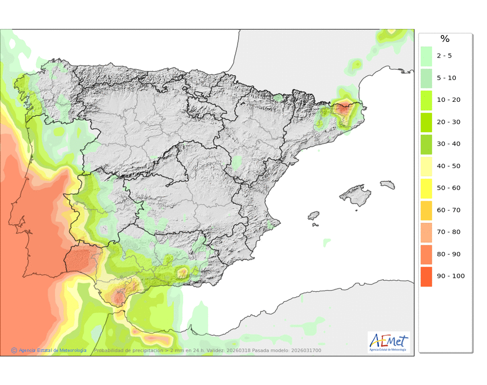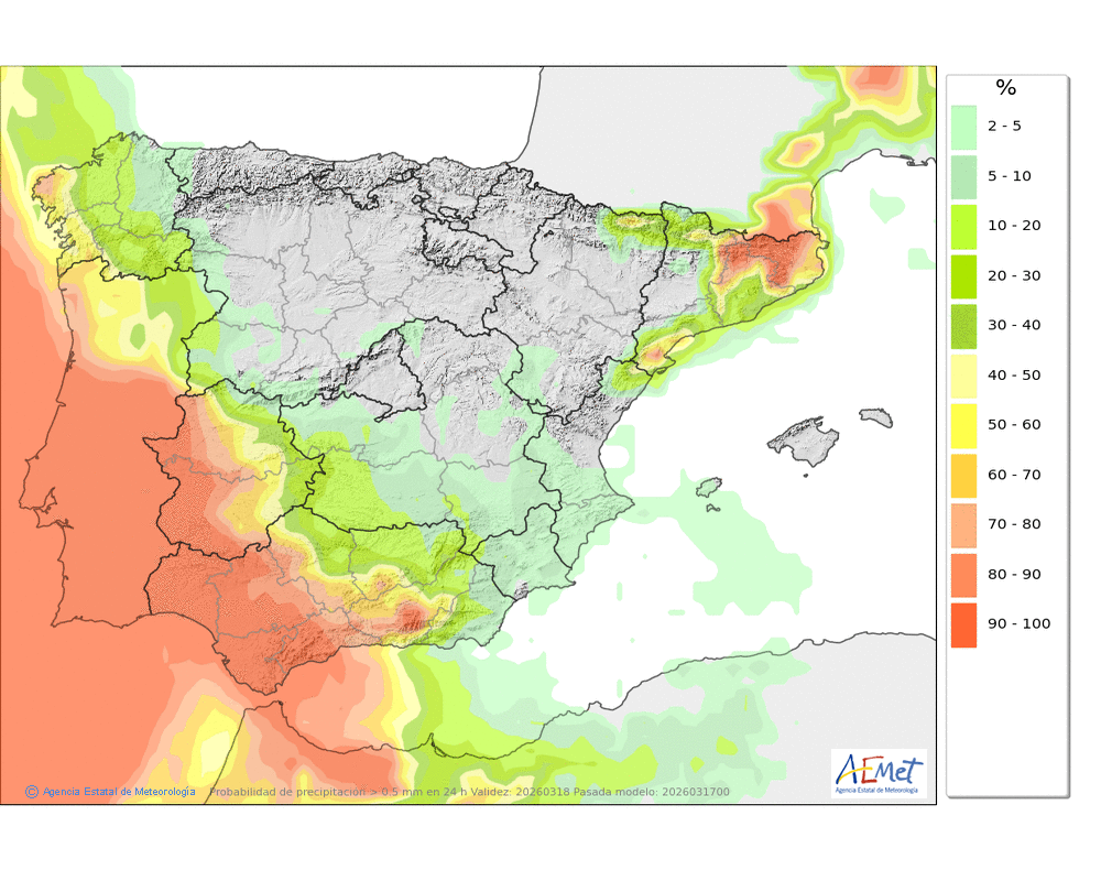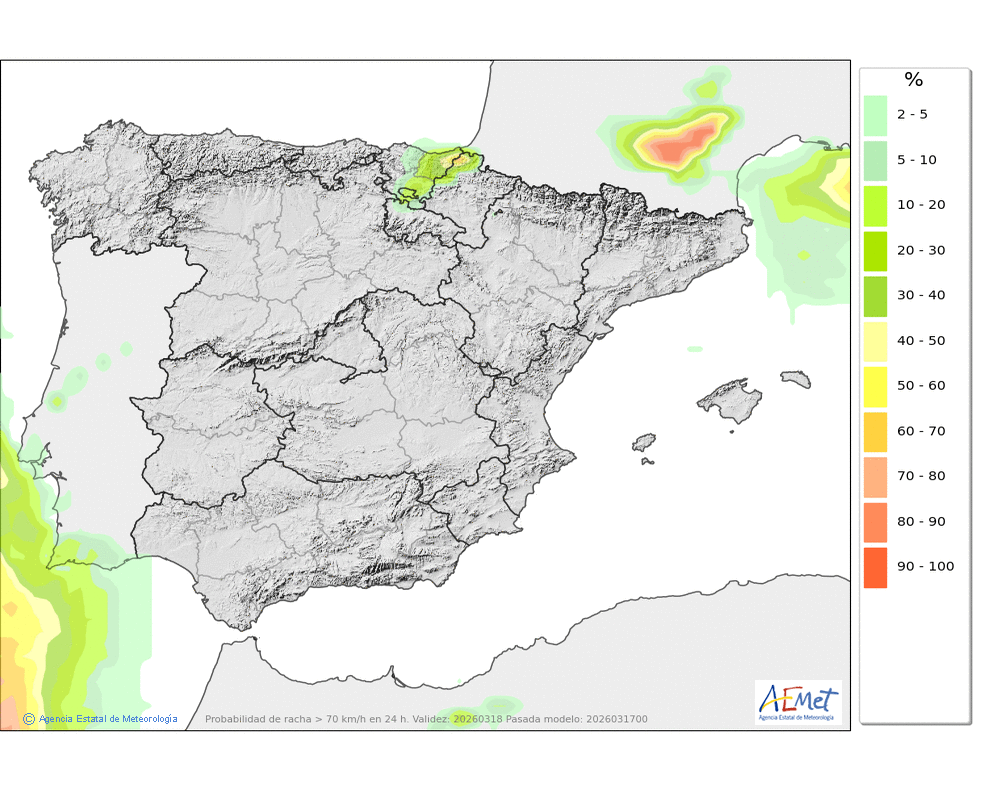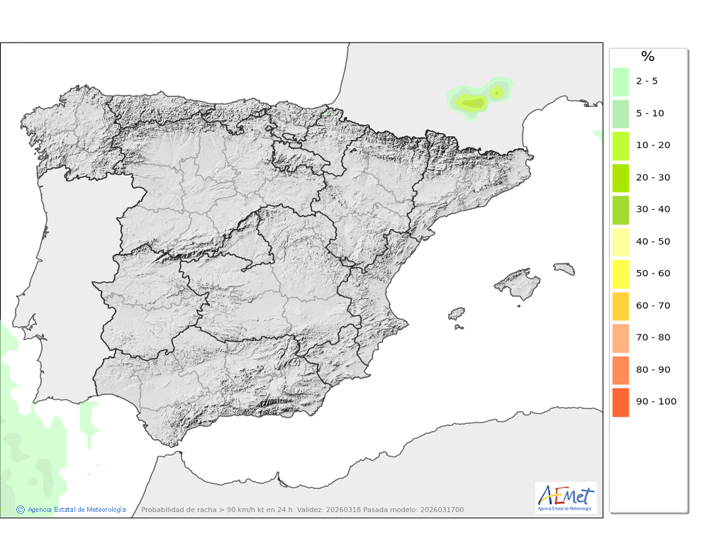 No se descartan algunas débiles en la segunda mitad del día, más probables e intensas al final, que podrán caer en forma de chubasco. Cota de nieve en torno a 2100-2200 metros.