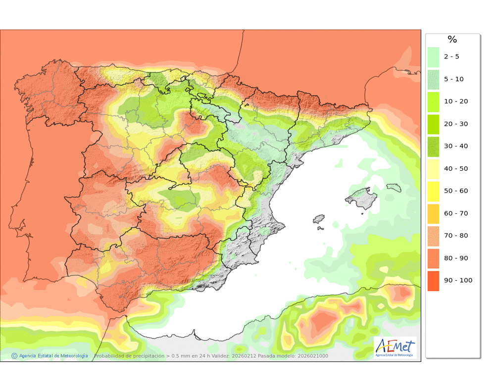 Probables débiles y dispersas. Cota de nieve en descenso, alcanzando los 1400 metros, volviendo a ascender por la tarde hasta los 1800.